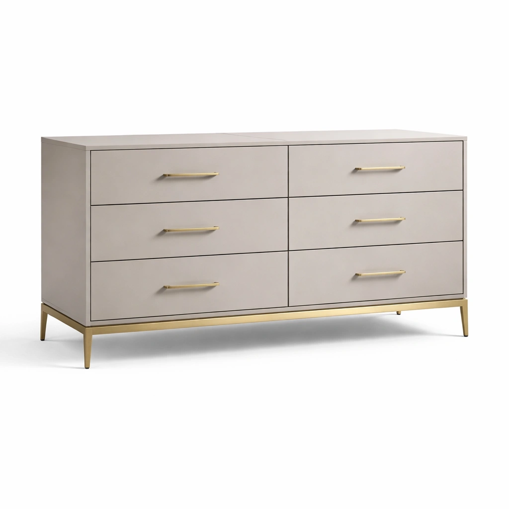 Cajonera de MDF beige con detalles de metal dorado
