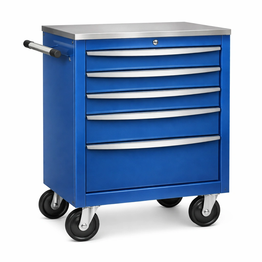 Carro de herramientas con estructura de acero y superficie de trabajo de acero inoxidable. Equipado con 5 cajones con correderas de metal y un mecanismo de bloqueo con llave en la parte superior. Las ruedas son de goma para facilitar el desplazamiento. Dimensiones: longitud 70 cm, anchura 45 cm, altura 90 cm. Peso: 36 kg.